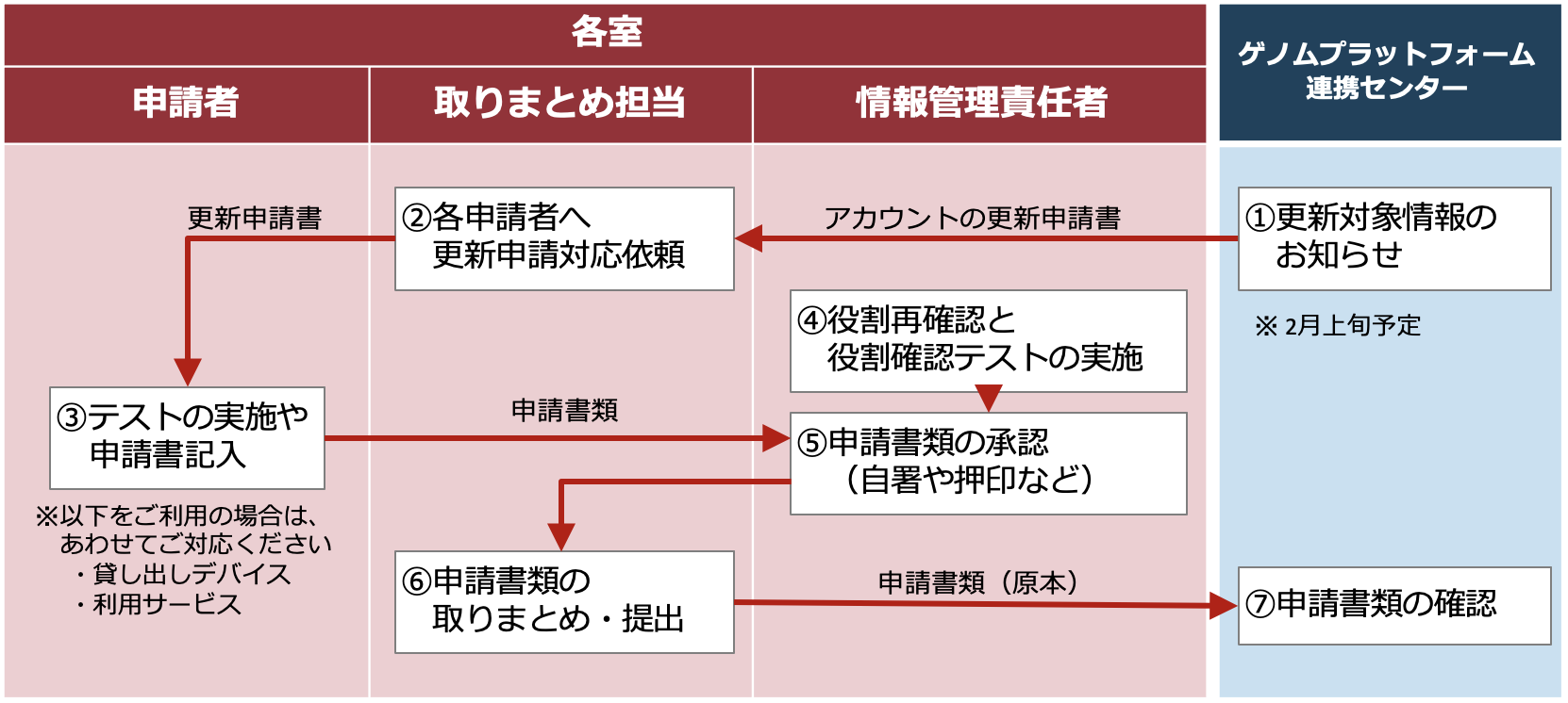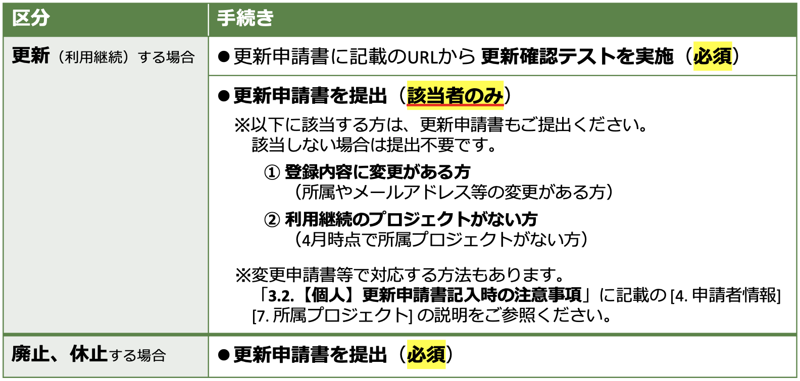 - アカウント(個人、プロジェクト)の更新対象情報は、2026年2月上旬に情報管理責任者等へお知らせします。2026年度の利用継続についてご確認頂き、 2. 更新手続きの期限 までにお手続きをお願いします。