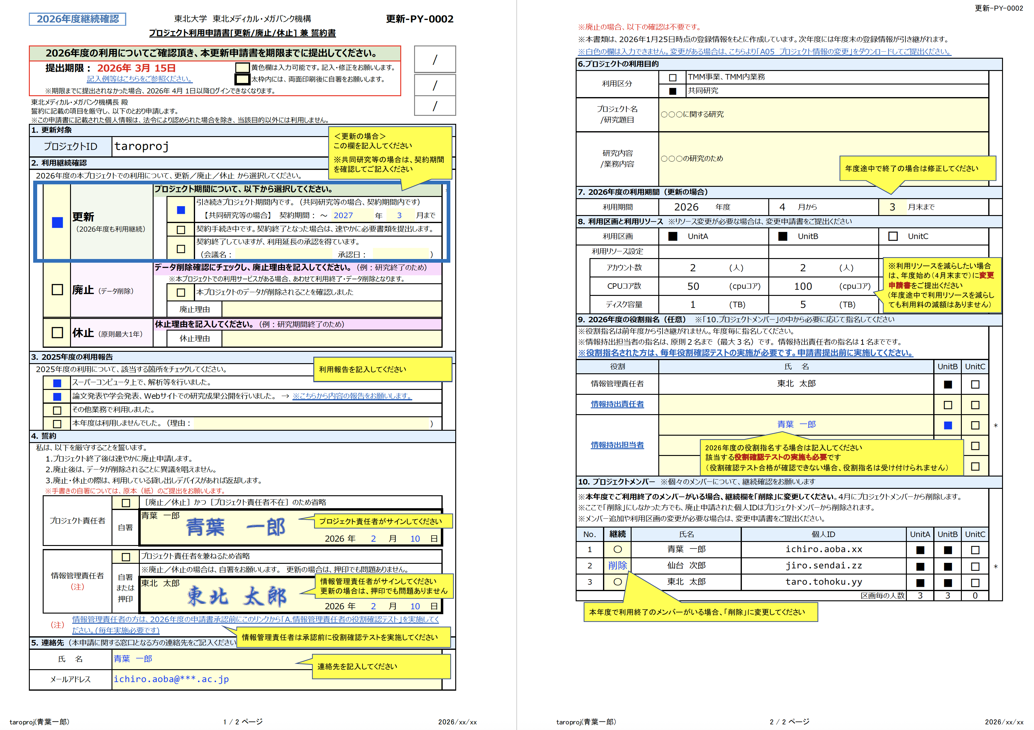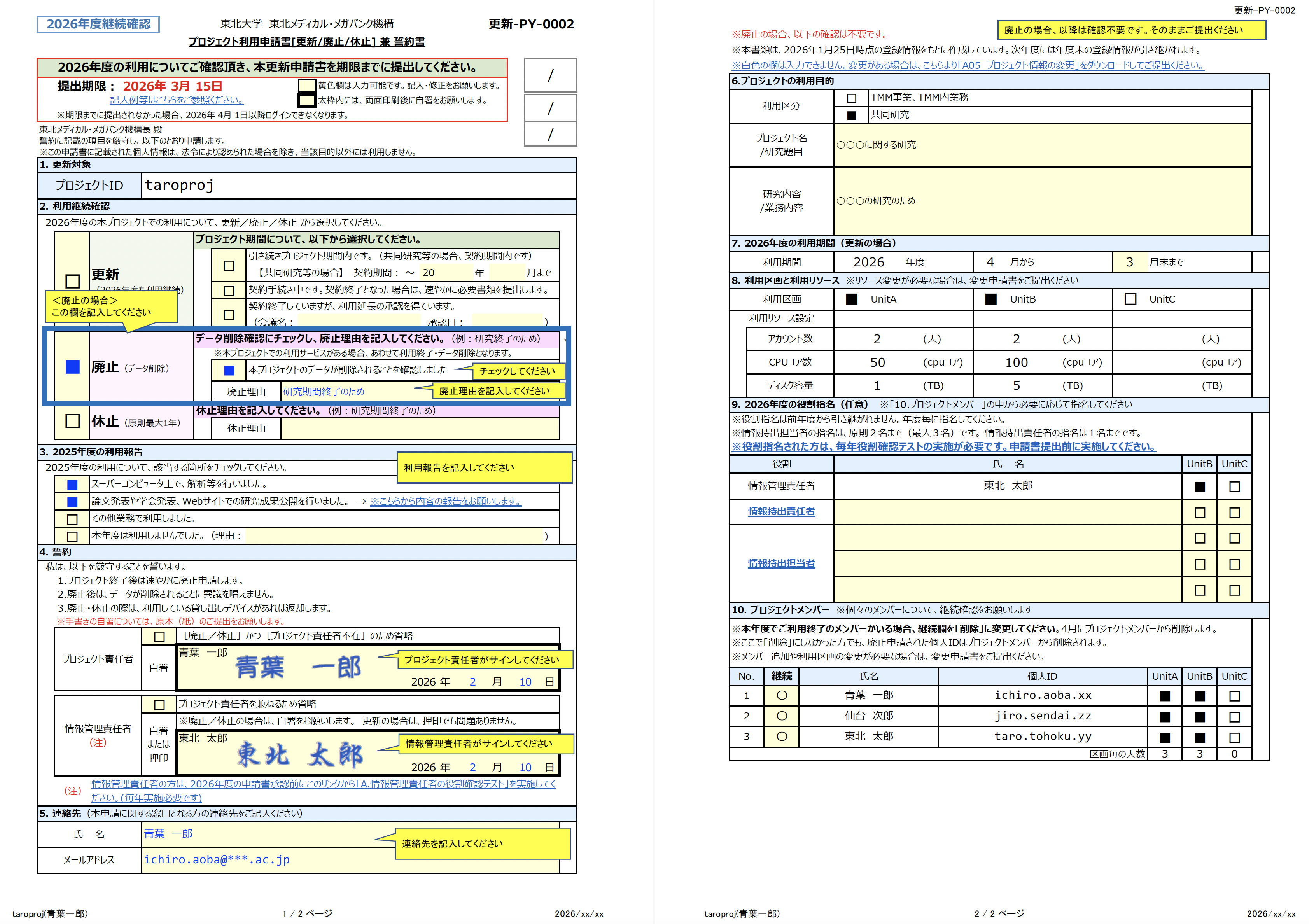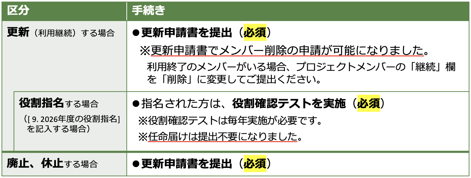 各プロジェクトIDについて、登録情報を記載した更新申請書を送付しますので、更新/廃止/休止のいずれかを選択してご提出ください。
