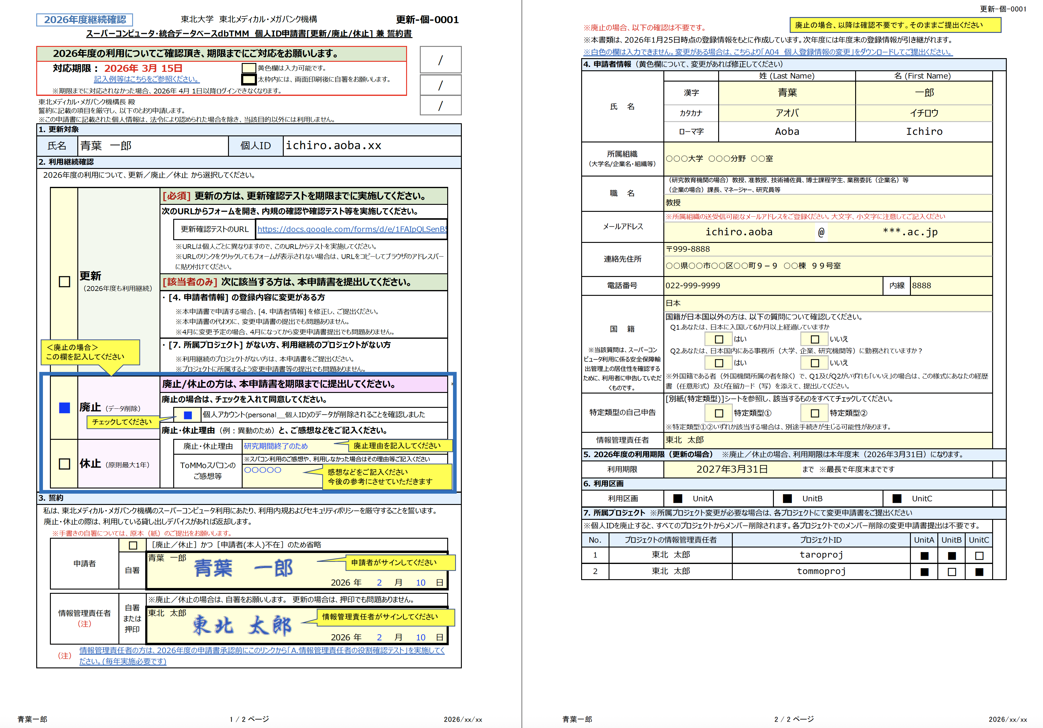 各個人IDの登録情報を記載した更新申請書を送付しますので、更新/廃止/休止のいずれかを選択してご対応ください。