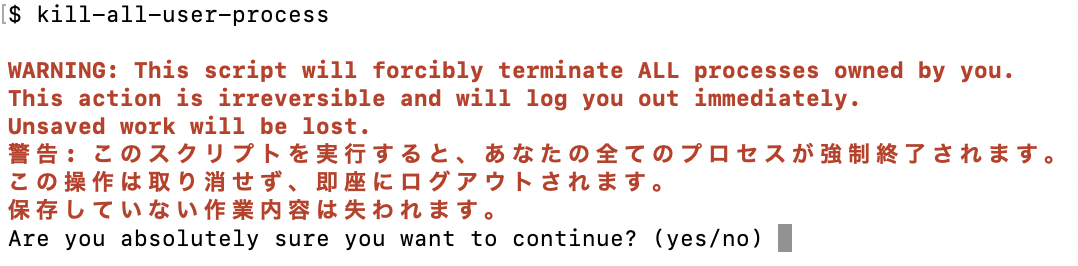 - コマンドを実行したユーザーの全てのプロセスが強制終了されます。